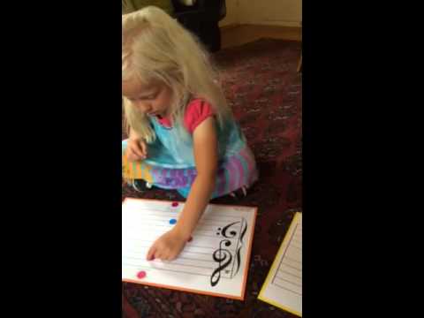 Last week her teacher sent a little video of Ellie putting markers on all the notes she asked her on bothe the bass and treble clef (Cs, G and F).