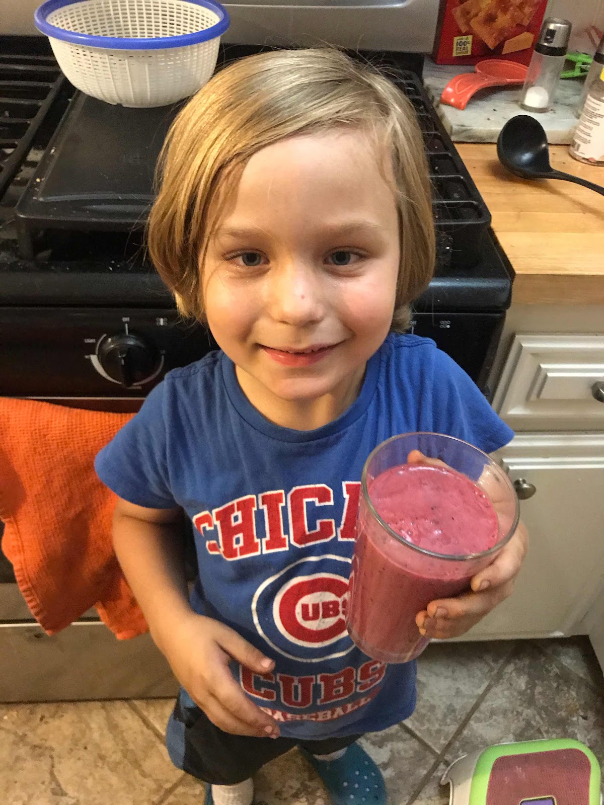 So enjoy a little boy drinking milk wearing a mask in clothes that are too big.